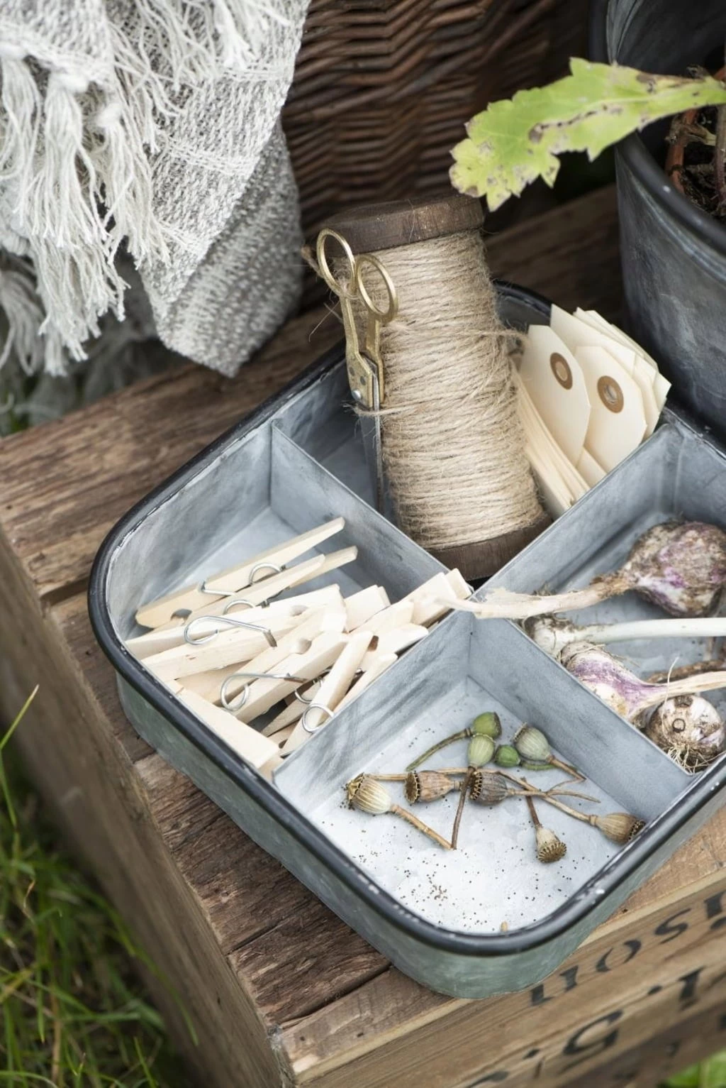 Ob Saatguttütchen, Bindefäden, Wäscheklammern oder sonstiges Kleinmaterial, in dieser robusten Allzweck-Kiste findet alles seinen Platz. Vier Fächer sorgen für übersichtliche Ordnung und dafür, dass du wichtiges Utensilien stets zur Hand hast, wenn du sie brauchst.