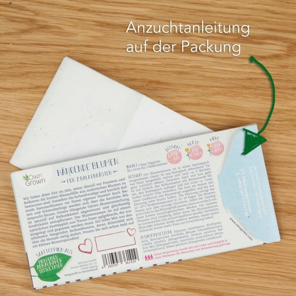 - 2 praktische Saatteppiche, die die genau richtige Menge an Saatgut in den optimalen Abständen enthalten und einfach zurechtgeschnitten werden können (Größe: 2 x 0,8 m)