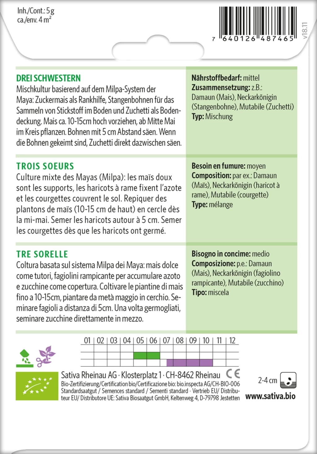 Mais ca. 10-15 cm hoch vorziehen, ab Mitte Mai im Kreis pflanzen. Bohnen mit 5 cm Abstand sÀen. Wenn die Bohnen gekeimt sind, Zuchetti direkt dazwischen sÀen.