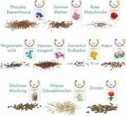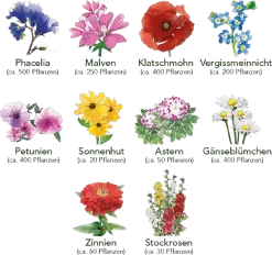 Bienenfreund Phacelia, Roter Klatschmohn, Zinnie, Malve, Sonnenhut, Vergissmeinnicht, Petunien, Astern, Gänseblümchen, Stock-Rose