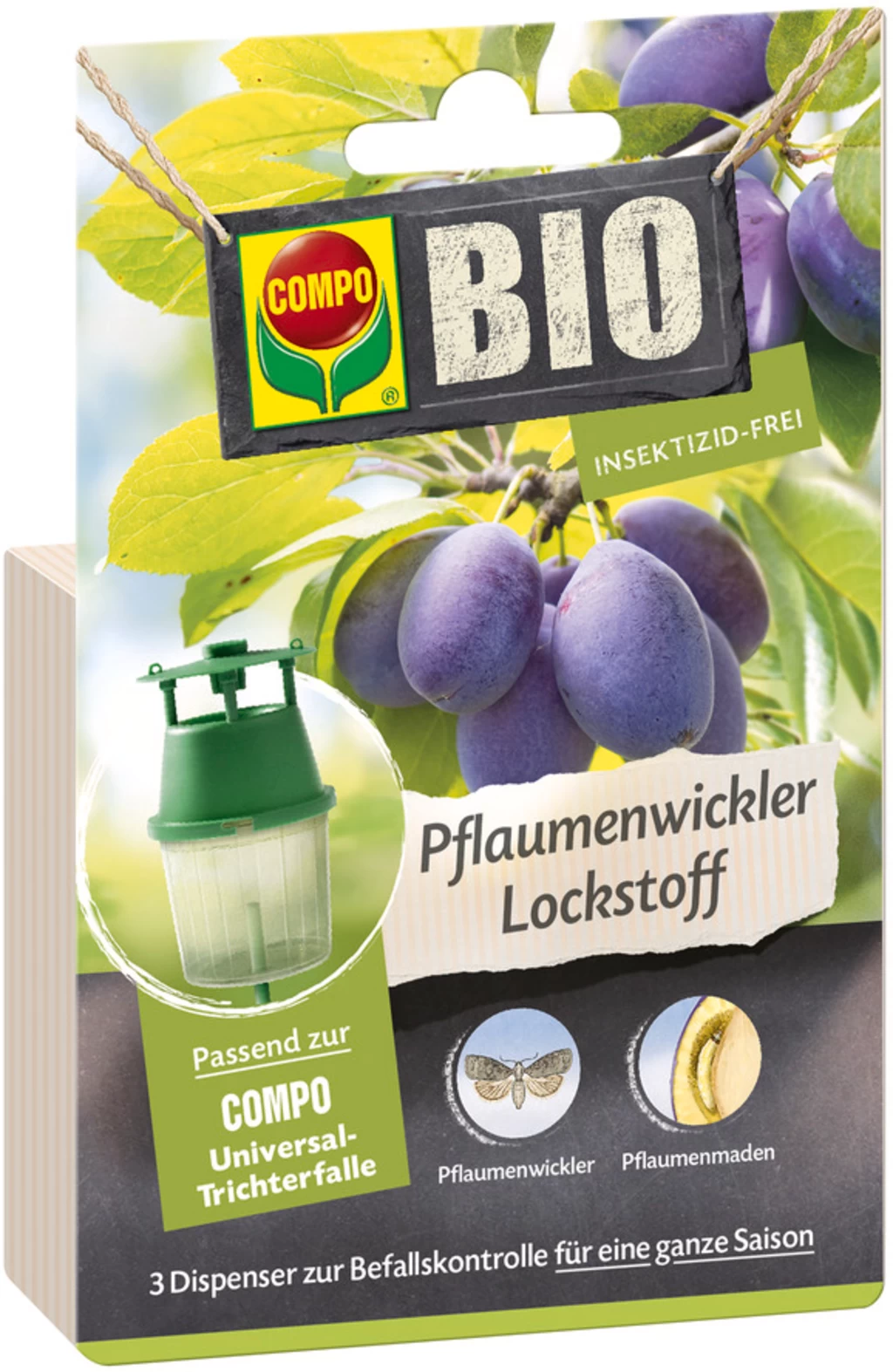 Hinweis: Der BIO Pflaumenwickler Lockstoff von COMPO eignet sich bestens in Kombination mit der COMPO Universal-Trichterfalle. Der Lockstoff kann jedoch auch mit anderen, handelsüblichen Dispenserkörben verwendet werden. Bitte die Gebrauchsanleitung der jeweiligen Falle beachten.