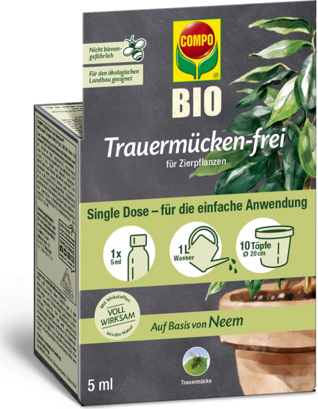 Das COMPO Trauermücken-frei wirkt mit der natürlichen Kraft des indischen Neembaums. Die biologische Einzelanwendung wird unkompliziert dem Gießwasser hinzugefügt und bekämpft pflanzenschädigende Trauermücken-Larven nachhaltig und effektiv.