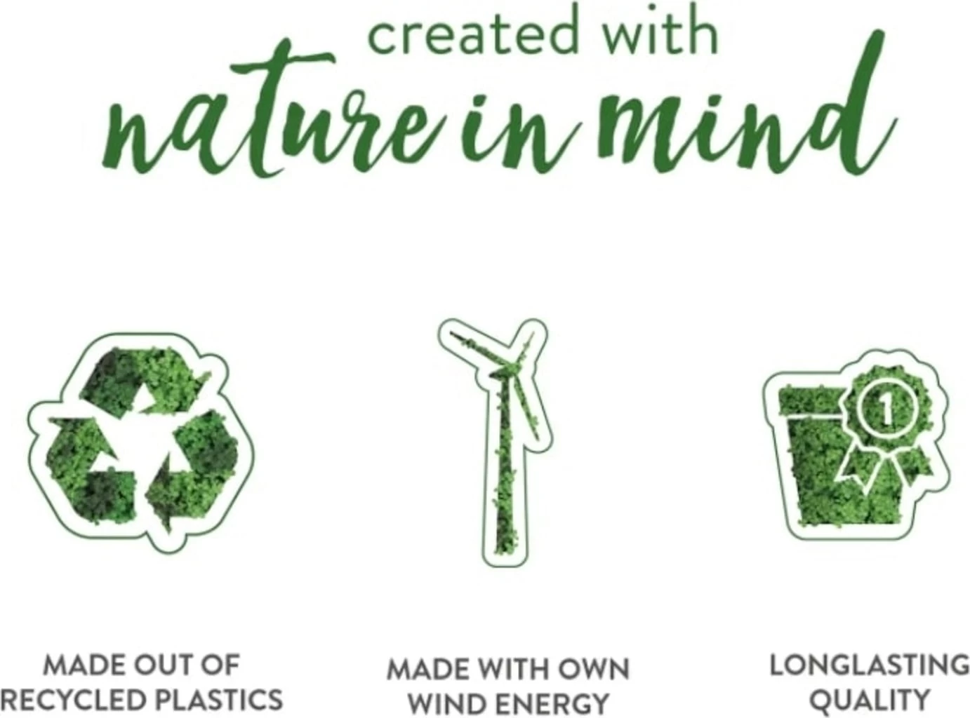 | Eigenschaften: | UV-beständig, Recycelter Kunststoff, Frostbeständig, Bruchsicher, 100 % recycelbar, Nachhaltig hergestellt, Wetterfest |