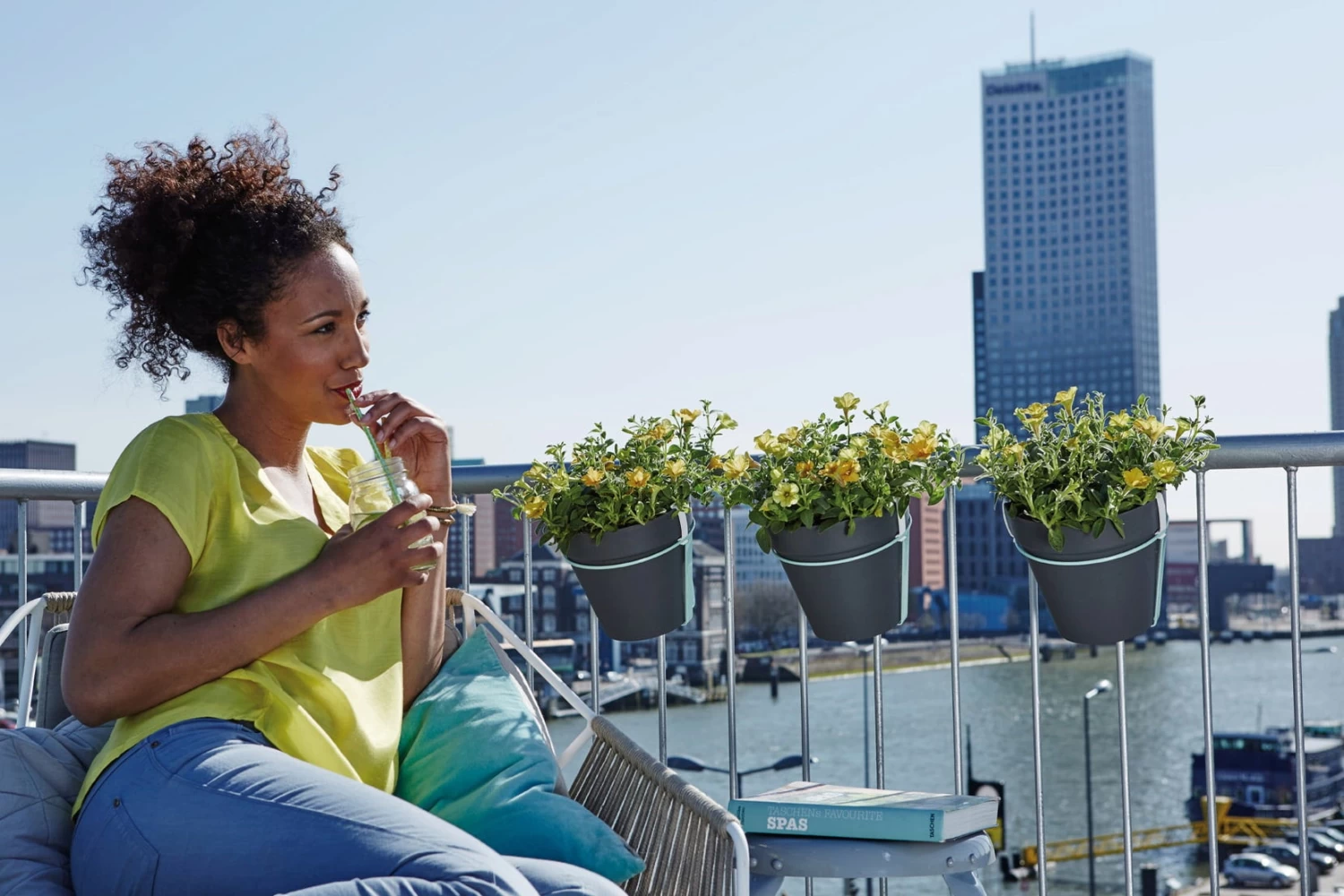 Mit dem Pflanztopfhalter fĂŒr das BalkongelĂ€nder verwandeln Sie Ihren Balkon im Handumdrehen in eine grĂŒne Oase. Der Pflanztopf wird zusammen mit dem Halter geliefert und lĂ€sst sich einfach an den Balkon hĂ€ngen. Und dank des Wasserreservoirs, in dem Regenwasser gespeichert wird, erhalten Ihre Pflanzen immer Wasser, wenn sie dieses benötigen. Einfacher und komfortabler geht es kaum.