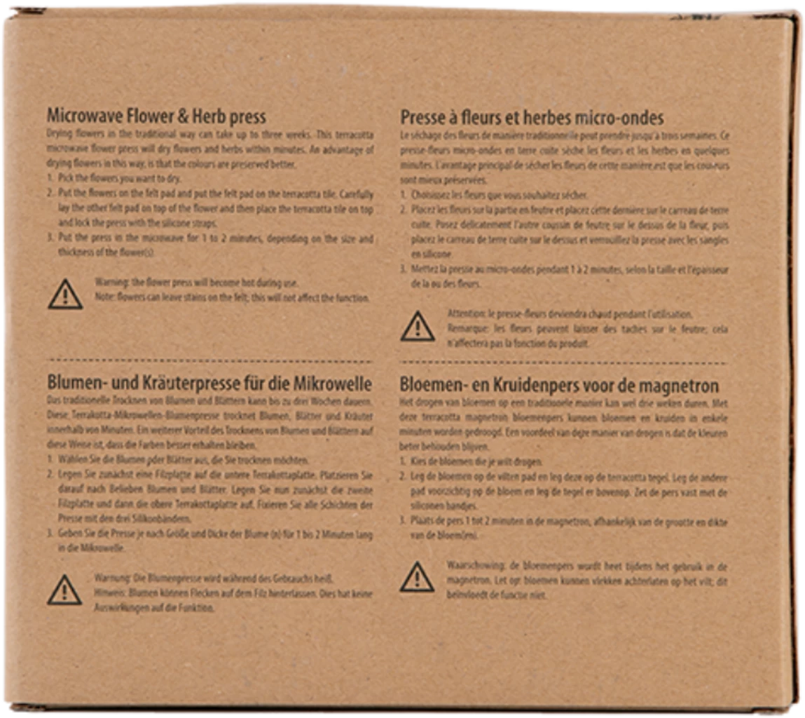 Mit Hilfe der innovativen Blumen- & Kräuterpresse Mikrowelle kannst du die Effizienz bei der Trocknung enorm steigern: beansprucht die klassische Vorgehensweise bis zu drei Wochen, ist die Dauer beim Einsatz dieses Produktes zwei bis drei Minuten. Zusätzlich zur Zeitersparnis werden mit dieser Methode die Farben der Pflanzen besser erhalten.
