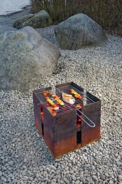 Die Feuerstelle bzw. der Grill „Fidibus“ wurde aus 3 mm dicken wetterfesten Stahl gefertigt, somit kann er das ganze Jahr ĂĽber drauĂźen stehen bleiben. Dank der WitterungseinflĂĽsse entwickelt er mit der Zeit, auf der anfangs noch stahlgrauen Oberfläche, eine einzigartige Rostoptik.