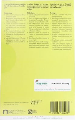 Öffnen Sie die Dose und entnehmen Sie den Lockstoffbeutel und die Leimfalle. Packen Sie den Lockstoff aus und tauchen Sie ihn 15 Sekunden in Wasser und legen Sie ihn danach auf den Dosenboden. Ziehen Sie das Schutzpapier von der Leimfalle ab und stellen Sie die Leimfalle mit der Klebeseite innen in die Dose. Dose wieder verschließen und aufstellen.