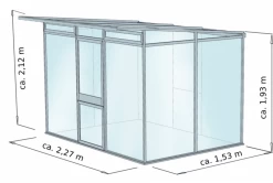 Das Gewächshaus „Jasmin“ II mit 6 mm Hohlkammerplatten macht sich hervorragend in kleinen wie auch größeren Hobbygärten. Das ansprechende Pultdach sorgt nicht nur für einen hohen Lichteinfall, sondern schafft außerdem eine angenehme Höhe, bei der ein ergonomisches Gärtnern Wirklichkeit wird. Die durchgängigen Aluminiumprofile sowie die ausgereifte Verglasungstechnik gewährleisten eine enorme Stabilität und die damit einhergehende Sicherheit.