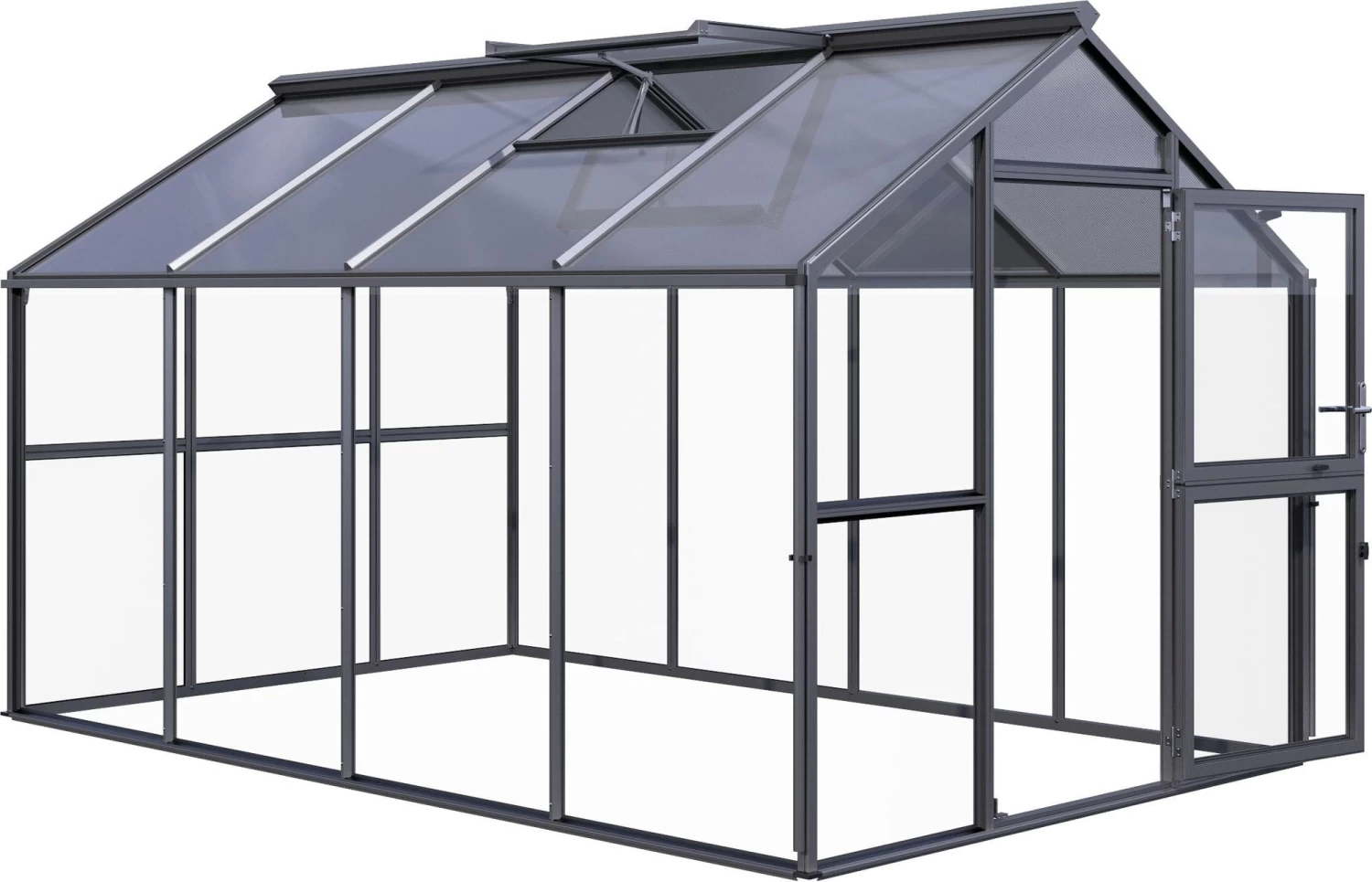 Die transparenten ISO-Hohlkammerplatten am Dach weisen mit ihrer Stärke von 10 mm eine sehr gute Wärmeisolierung auf, wohingegen die Seitenwände aus Sicherheitsglas für einen freien Blick nach draußen sorgen. Durchgängige Aluminiumprofile sowie eine ausgereifte Verglasungstechnik sorgen für die notwendige Stabilität. Das edle Farbbild in Anthrazit verkörpert dabei zeitlose Eleganz, sodass sich das Gewächshaus mit Leichtigkeit in jeden Gartenstil einfügt.