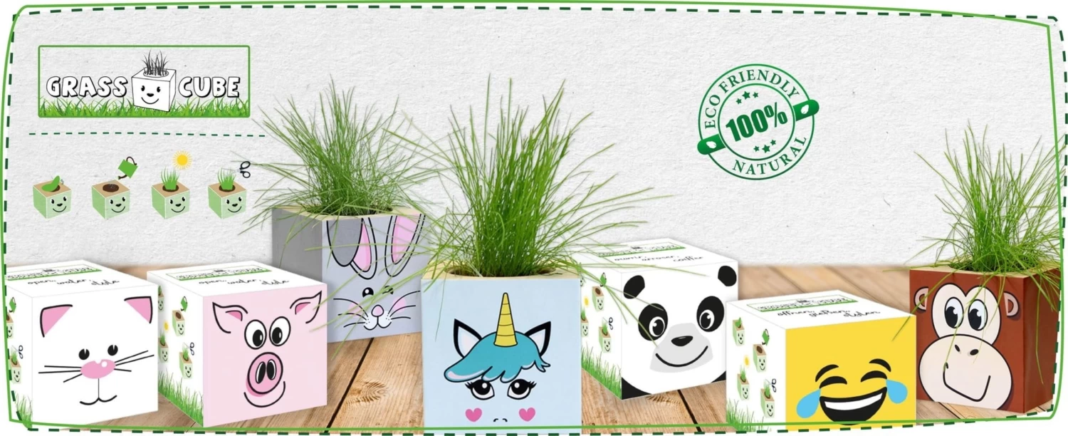 Der „Grass Cube“ ist ein wachsender HolzwĂĽrfel, er enthält Pflanzensamen und ein spezielles Wachstumsgranulat. Nach nur wenigen Tagen wächst das Gras an und eine individuelle Frisur der stubenreinen Tierchen kann geschnitten werden. Ein absolutes Geschenk-Highlight und toller Hingucker, der nicht nur Kindern groĂźe Freude bereitet!