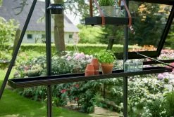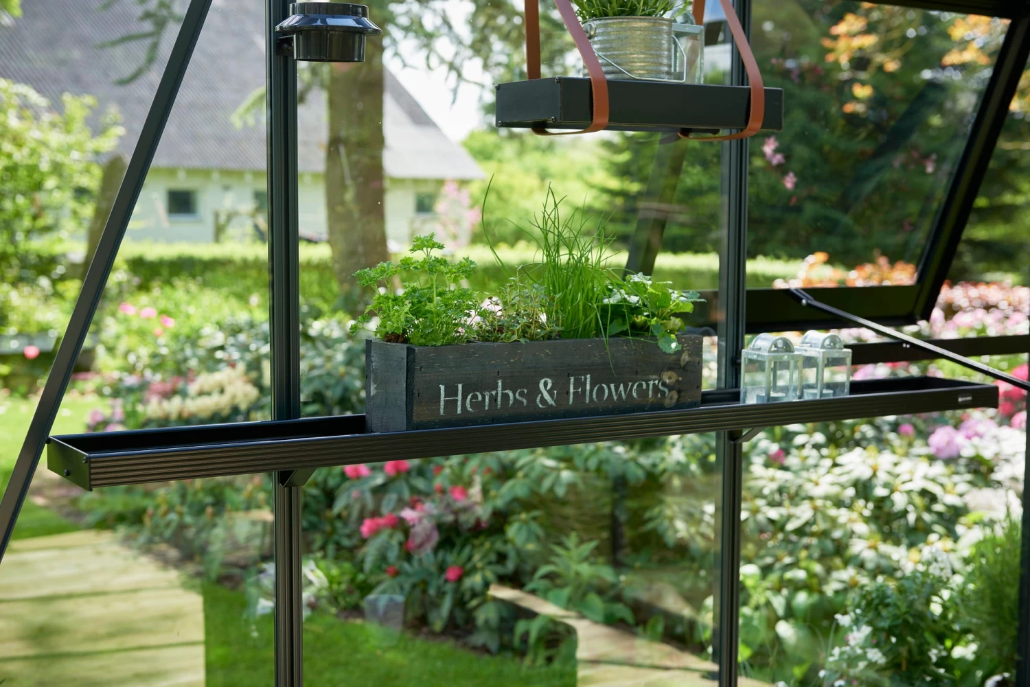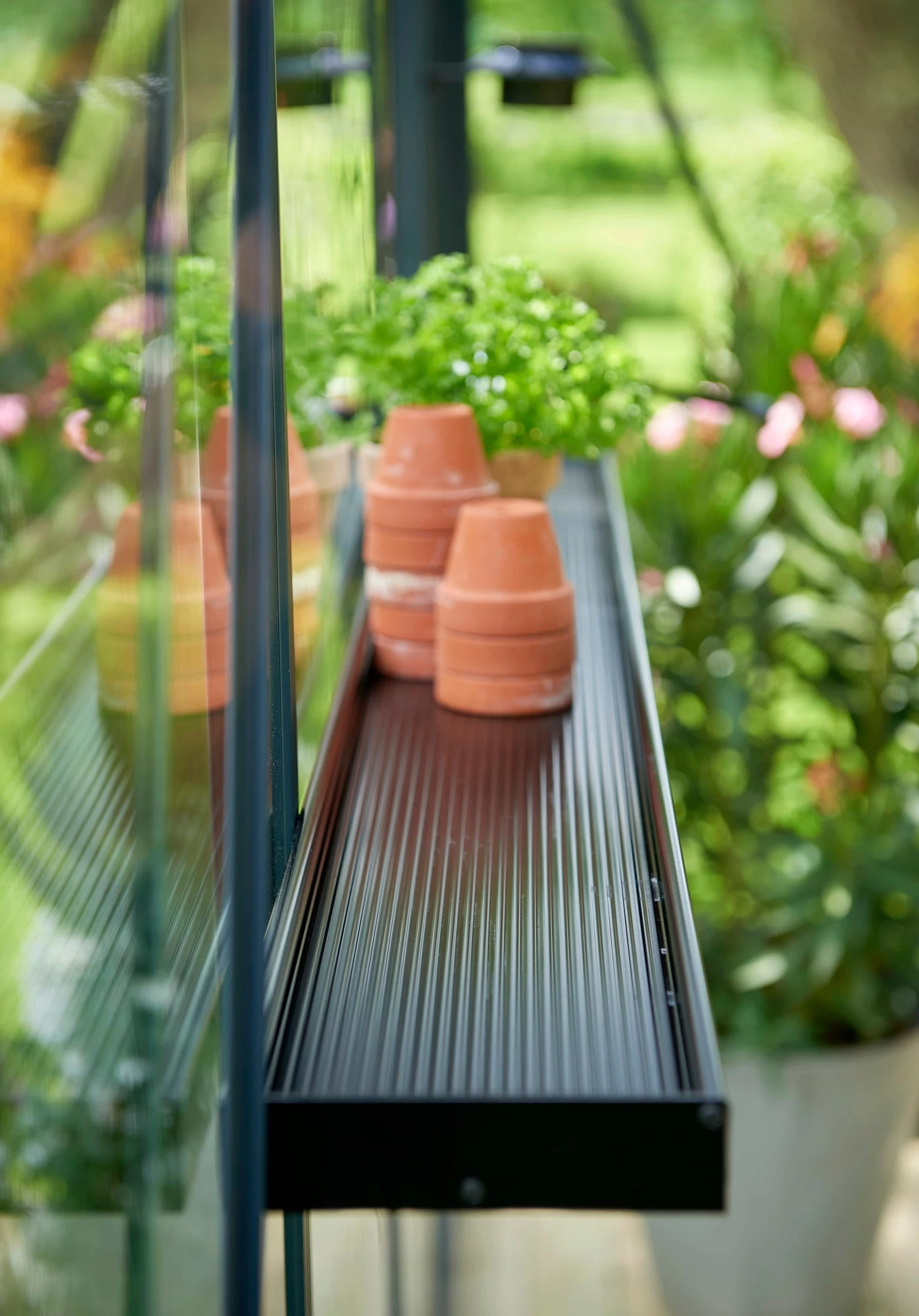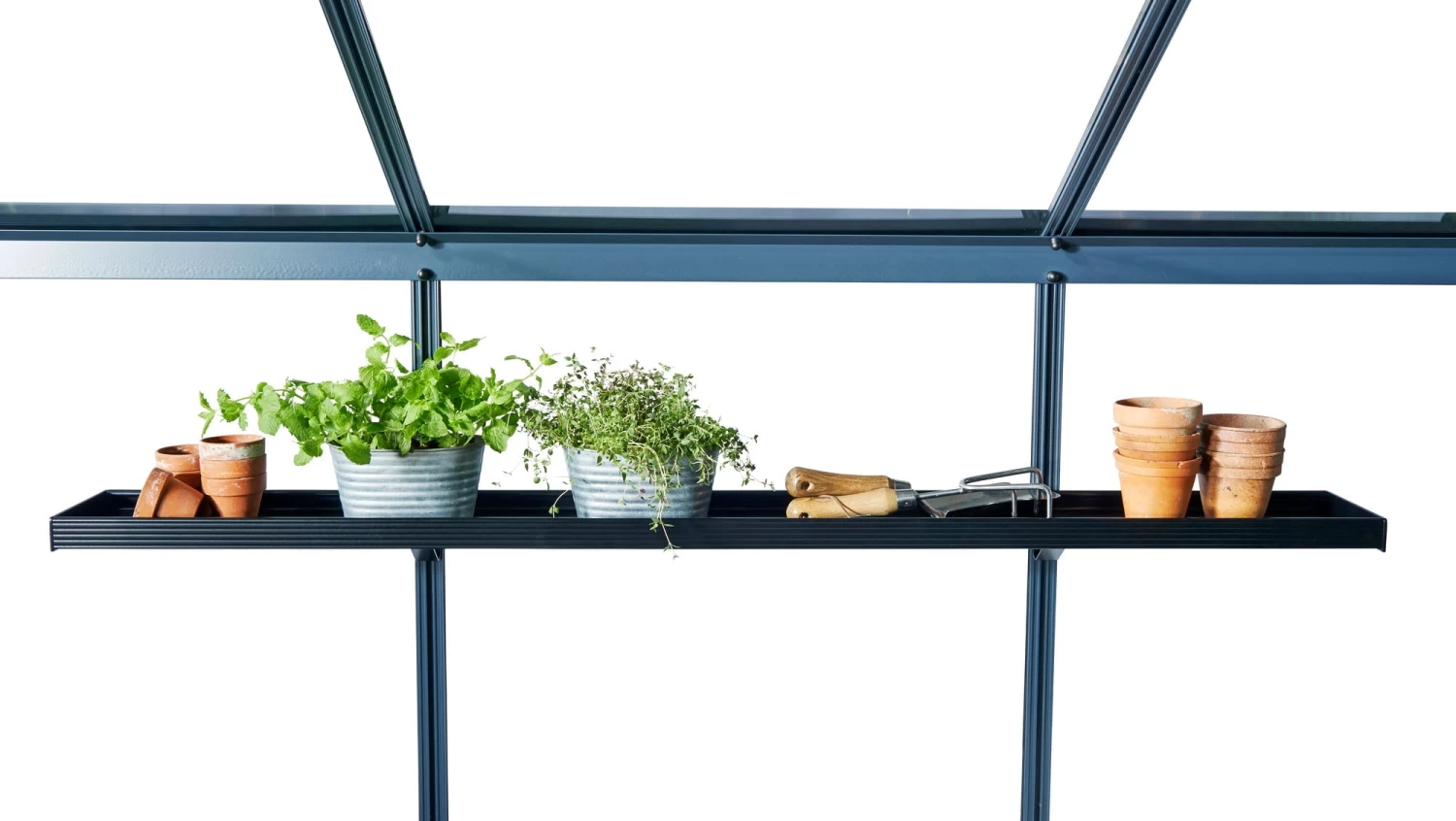 Dieses Regalbrett fügt sich nahtlos in den Stil deines Juliana Gewächshauses ein und bietet genügend Ablage- bzw. Stellfläche für Töpfe, Werkzeuge oder Pflanzen. Da das Regalbrett an den Seiten mit Dichtungen versehen ist, lässt es sich auch mit Wasser befüllen. Somit kannst du bei Bedarf deine Pflanzen darin tauchen, um diese in der heißen Jahreszeit vor dem Austrocknen zu bewahren.