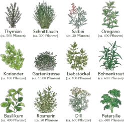 Basilikum, Schnittlauch, Dill, Koriander, Gartenkresse, Petersilie, Thymian, Salbei, Rosmarin, Oregano, Bohnenkraut, Liebstöckel