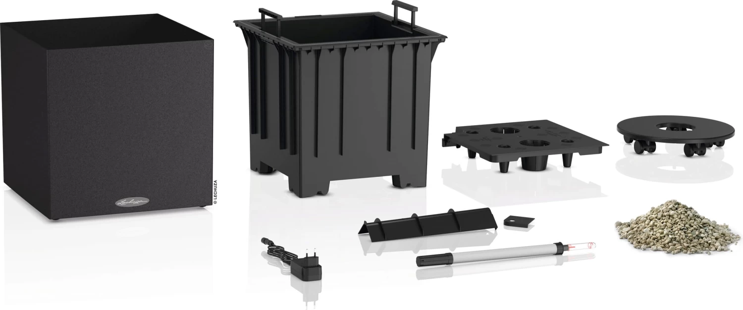 Lieferumfang: Pflanzgefäß + Pflanzeinsatz mit versenkbaren Tragegriffen + Lechuza Bewässerungsset + LED-Beleuchtung + Fernbedienung