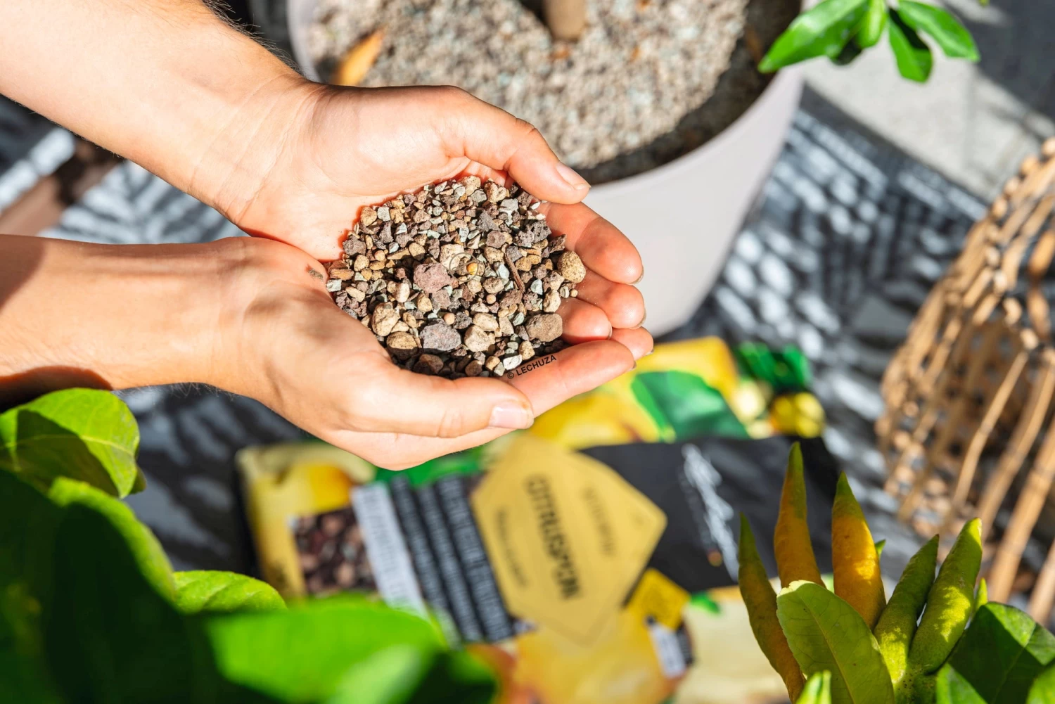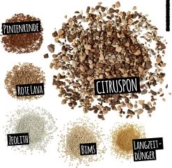 Zusammensetzung: Gestein (Bims, rote Lava), Zeolith, Pinienrinde, DĂĽngemittel (speziell fĂĽr Zitruspflanzen)