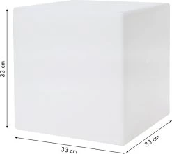 Der aus hochwertigem und robustem Kunststoff gefertigte Leuchtwürfel „Shining Cube“ sorgt sowohl drinnen als auch draußen für ein stimmungsvolles Ambiente, egal ob als Lampe, Beistelltisch oder Hocker. Mittels der im Lieferumfang enthaltenen Fernbedienung kann die Lichtfarbe des vorinstallierten RGB LED-Leuchtmittels beliebig gewählt werden: 15 Farben, 5-fach dimmbar stehen zur Auswahl. Ein absoluter Blickfang, der sich sowohl im Innen- als auch im geschützten Außenbereich wohlfühlt.