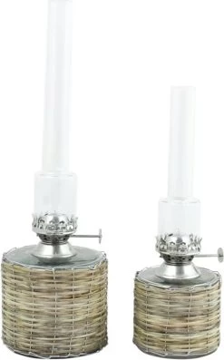 Der Glasbehälter dieser Petroleumlampe ist mit einem wunderschönen Korbgeflecht ummantelt, wohingegen der Brenner in Silber gehalten wurde. Der Glaszylinder schützt die Flamme vor dem Verlöschen. Mit dem Einstellrad kann die Höhe der Flamme und somit auch die Lichtstärke angepasst werden.