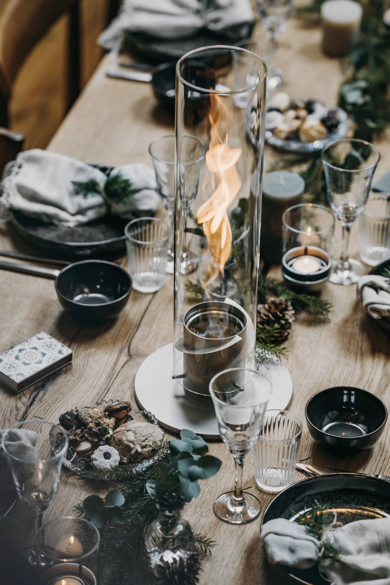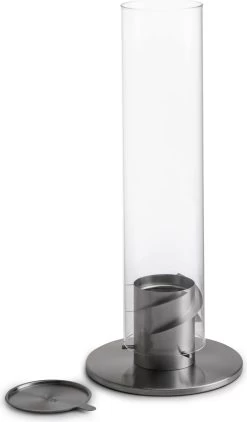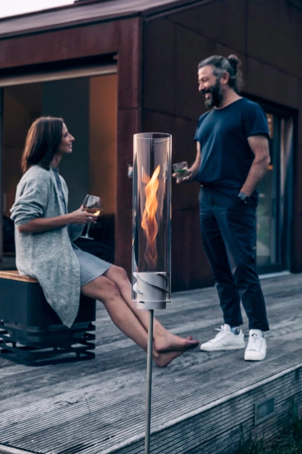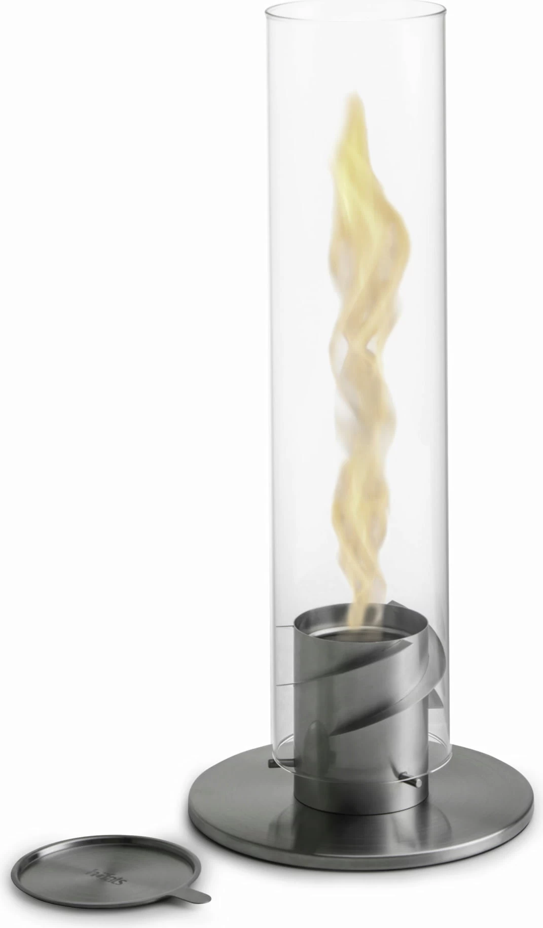 Die Befeuerung gelingt denkbar einfach: Bio-Ethanol-Dose in den Fuß einsetzen, entzünden und Glaszylinder aufsetzen. Schon rotiert die Flamme und sorgt bis zu 80 Minuten für ein gemütliches Wohlfühl-Ambiente.