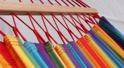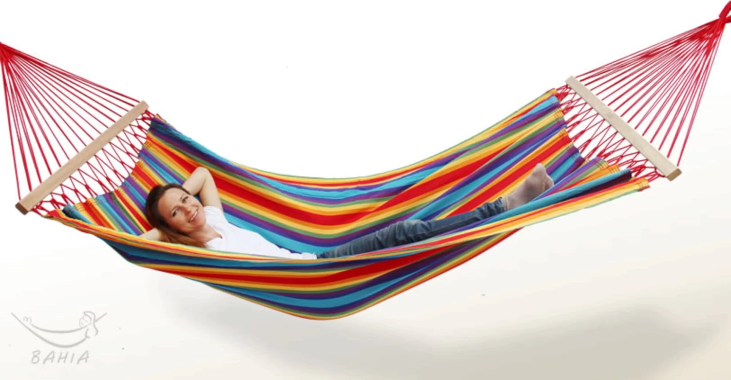 Stabhängematte mit 110 cm breitem Stab, aus ökologisch FSC®-zertifiziertem Holz. Die Angenehme Größe ladet zum Entspannen für drinnen und draußen ein. Sie wurde aus 100% echter Baumwolle, AZO-frei und nach eco tex 100 Standard hergestellt und hat eine Belastbarkeit bis maximal 110 kg.