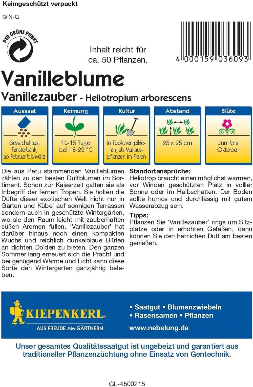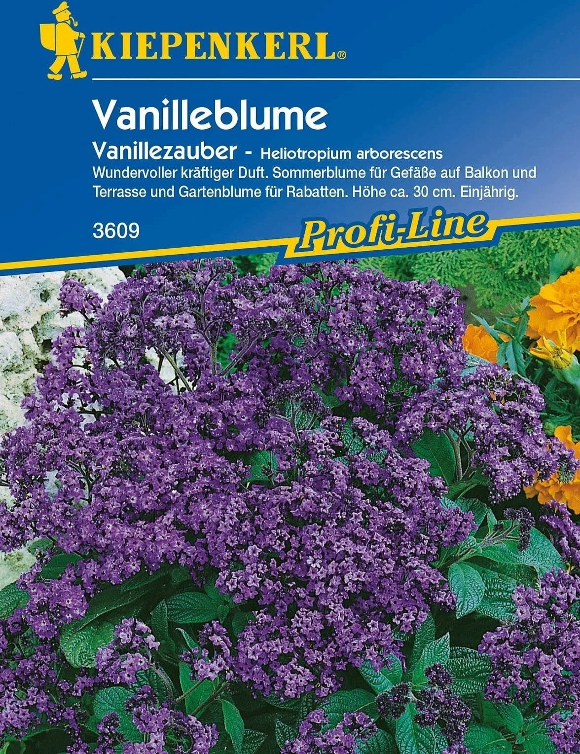 Die aus Peru stammenden Vanilleblumen zĂ€hlen zu den besten Duftblumen im Sortiment. Schon zur Kaiserzeit galten sie als Inbegriff der fernen Tropen. Sie holten die DĂŒfte dieser exotischen Welt nicht nur in GĂ€rten und KĂŒbel auf sonnigen Terrassen sondern auch in geschĂŒtzte WintergĂ€rten, wo sie den Raum leicht mit zauberhaften sĂŒĂen Aromen fĂŒllen. ‚Vanillezauber‘ hat darĂŒber hinaus noch einen kompakten Wuchs und reichlich dunkelblaue BlĂŒten an dichten Dolden zu bieten. Den ganzen Sommer lang erneuert sich die Pracht und bei genĂŒgend WĂ€rme und Licht kann diese Sorten den Wintergarten ganzjĂ€hrig beleben.