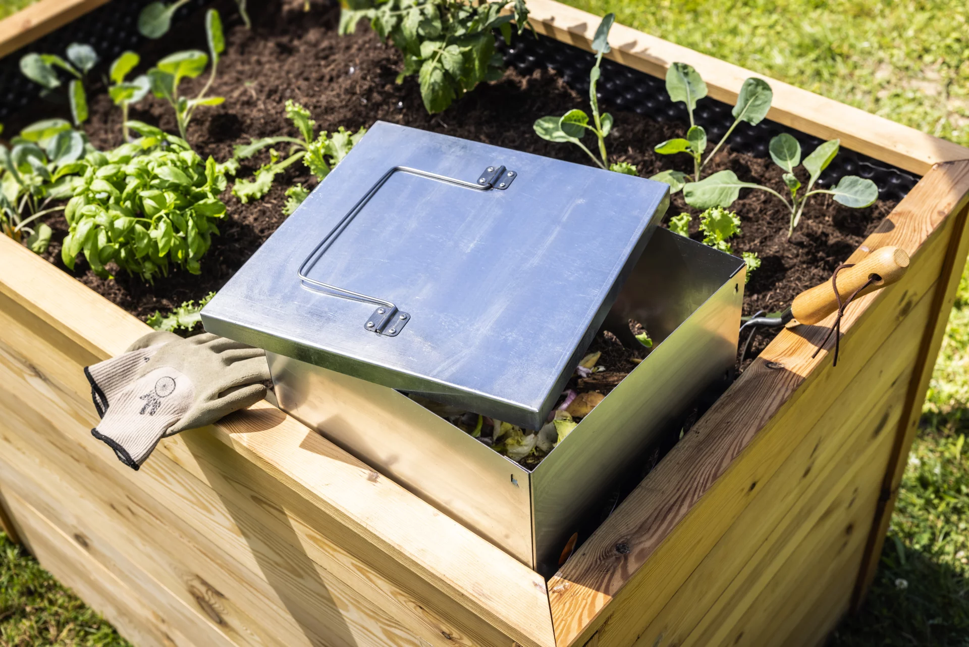 Mit diesem praktischen Deckel aus verzinktem Stahl verwandelst du deinen Hochbeetkomposter von einem offenen in ein geschlossenes System. Dabei wirkt er der Unkrautbildung entgegen, verhindert die Austrocknung des Komposts sowie die Ausbreitung unangenehmer Gerüche. Ein handlicher Griff erleichtert das mühelose Anheben des Deckels, sodass der Komposter jederzeit mit weiteren Bio-Abfällen befüllt werden kann.