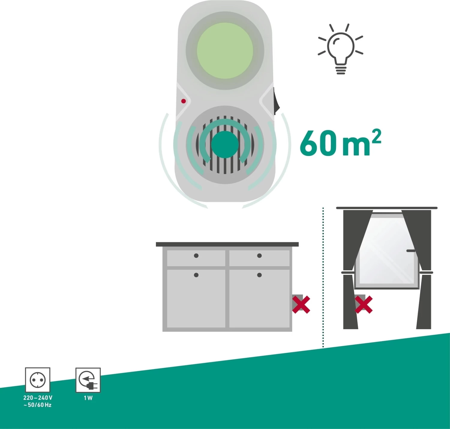 - Vertreiber nicht durch Vorhänge oder Kleinmöbel verdecken