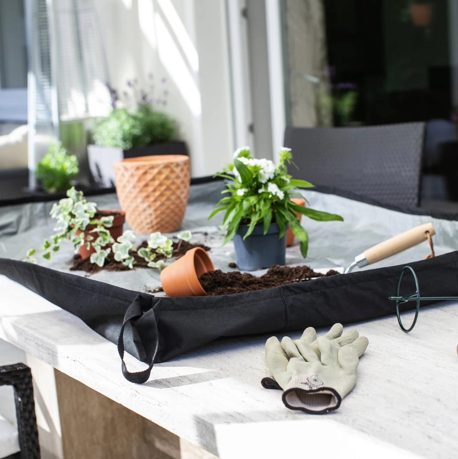 Ăśberaus praktisch fĂĽr Pflanz- und Umtopfarbeiten fĂĽr drinnen und drauĂźen. So bleibt alles sauber.