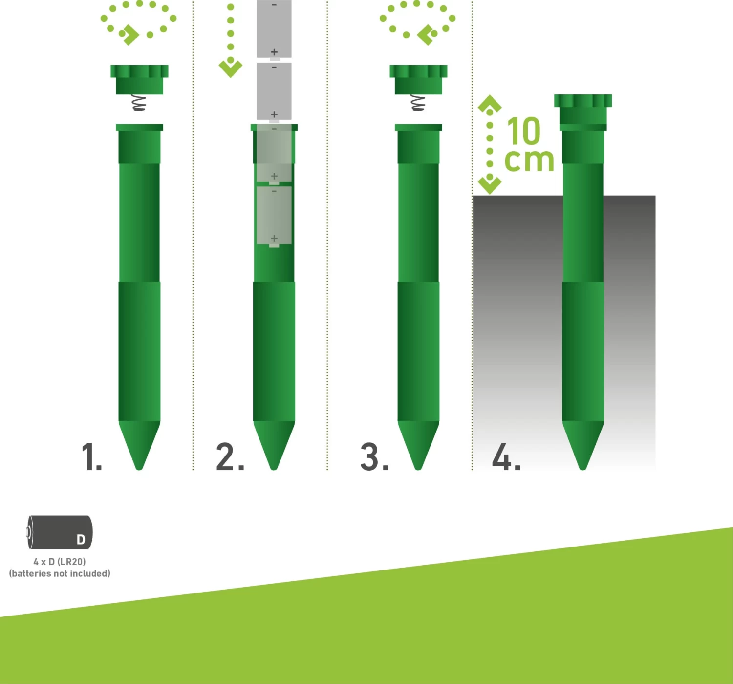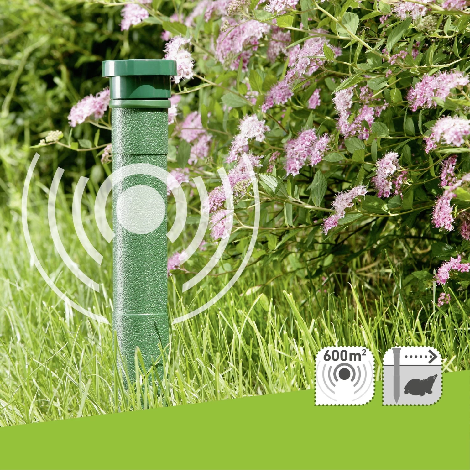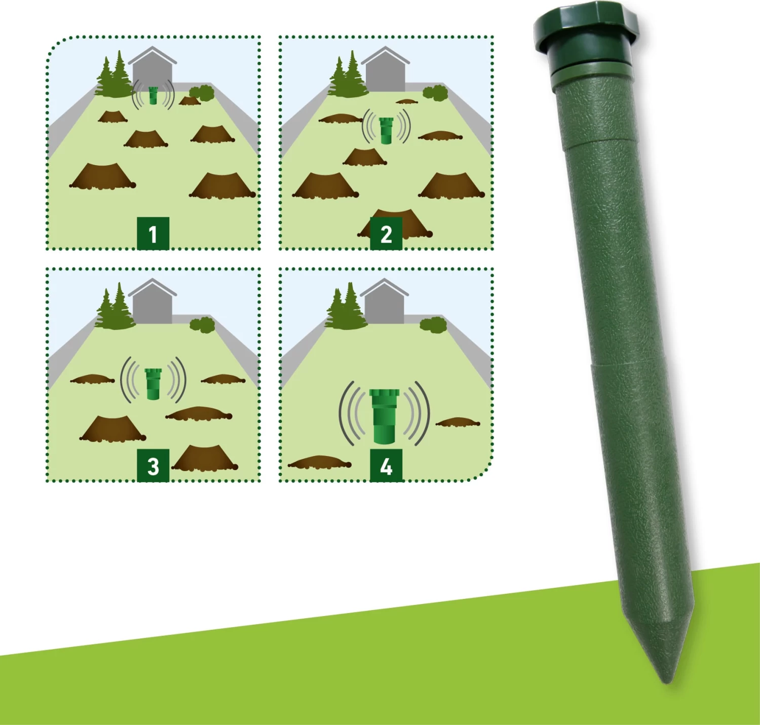 Ohne Einsatz von Chemie lassen sich hier Wühlmäuse und Maulwürfe dank der kreisförmig verbreitenden niederfrequenten Schallwellen erfolgreich vertreiben. Für das menschliche Ohr sind die Wellen nur minimal wahrnehmbar, die Schädlinge jedoch ergreifen sofort die Flucht.